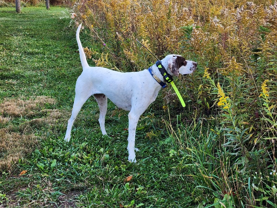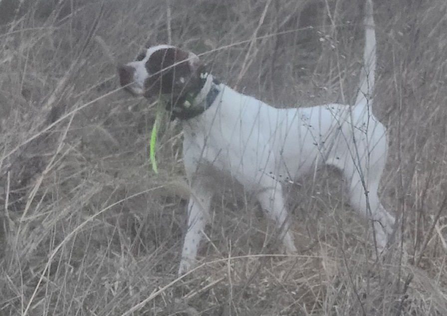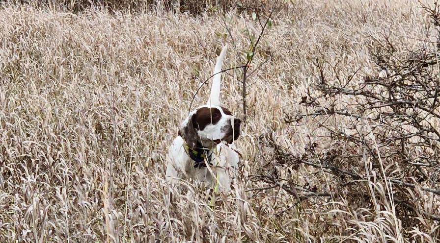 Penny is a 46lb female that hunts to the type of cover she's in. She will crawl under briar bushes and cedar trees to find birds. She is also a very good natural retriever.